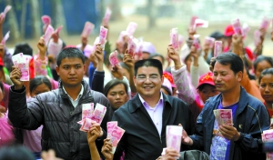 3月16日,陳光標到盈江“3·10“地震災區(qū)為受災群眾發(fā)錢。張玉杰