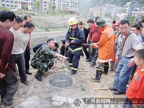4月23日下午5時(shí)許,一名年約8歲的男孩在鳳山縣政府對(duì)面的那馬橋頭處玩耍時(shí),跳上一個(gè)尚未安裝好蓋子的下水道井口,沒想到蓋在井口上的木板承受不住,男孩跌入10米深的井中。事故發(fā)生后,鳳山縣消防大隊(duì)消防員巧用竹簍救出男孩。