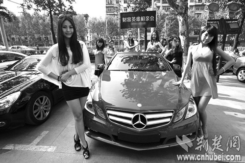 昨日,在武漢舉辦的一場財富英雄相親會上,九臺總價超千萬元頂級奔馳車隊,載著美女模特巡游江城 (記者萬多攝)