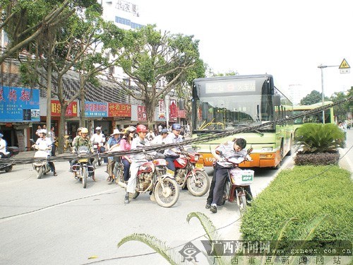 昨日(25日)下午,一輛滿載小食品的大貨車行至南寧市五一東路29號(hào)附近時(shí),由于將橫穿馬路上空的電纜線刮落,同時(shí)導(dǎo)致5根水泥電線桿斷裂歪倒,車輛通行受阻。事故發(fā)生后,交警、城管等部門立即找來竹梯,將墜落的電纜線支撐起來,使過往車輛能緩慢通行。