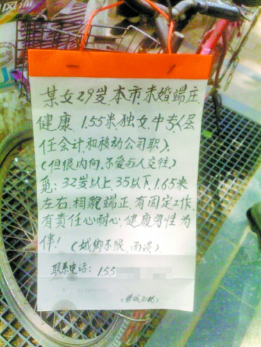 兒女的婚事一直是父母心中的大事。當(dāng)今,“剩男剩女”與日俱增,“男大不婚、女大不嫁”的現(xiàn)象越來越普遍,令不少家長愁眉不展,無奈之中他們只好親自上陣。在鄭州嵩山路上的一個小游園內(nèi),每逢周末,由父母們自發(fā)組成的相親會就會熱鬧開場。隨著相親會上人數(shù)越來越多,父母開出的條件也越來越高:男要錢女要貌、高學(xué)歷、好工作,樣樣不能少,更有心急的家長虛報子女條件。一些年輕人對父母的這種做法表示理解,但難免覺得“有點煩”,希望父母能尊重兒女的意見。