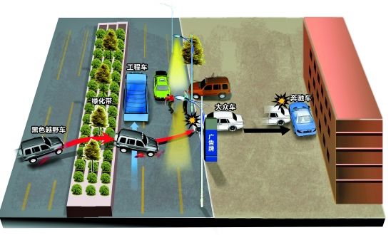 2時(shí)53分01秒,一輛工程車由南往北駛過(guò)。5秒后,一輛黑色越野車突然由西向東從綠化帶中飛了出來(lái)。