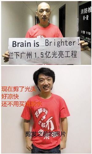 “征集光頭,照亮廣州”,27日凌晨1時(shí)許,一位網(wǎng)名“brainisbrighter”的廣州仔發(fā)表了一篇題為《征集廣州市民剪光頭照亮廣州,攔下1.5億光亮工程》的博文,同時(shí)貼出自己削發(fā)過程等照片,并在新浪微博轉(zhuǎn)發(fā),引來眾多網(wǎng)民熱議。