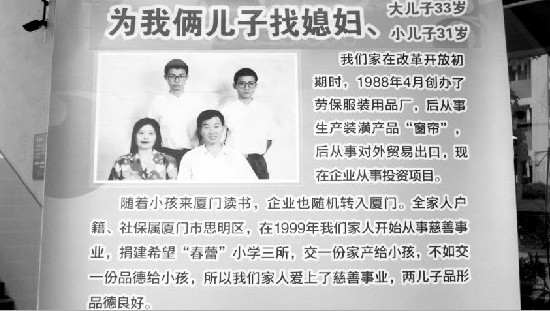 他直接在廈大海韻公寓的食堂門口豎起了征婚廣告牌,還把兒子的個人資料放在一邊,像傳單一樣供人取閱?梢,秦老伯的心情是何等焦慮!