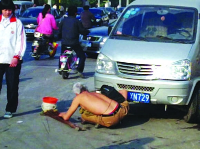 “一開始看到這個乞丐,光著上身,在馬路的車流上爬行,就覺得非常危險!眻D片的拍攝者趙先生告訴記者,最初他完全是覺得這個乞丐這樣容易被車撞到。“當時在玄武區(qū)月苑菜場門口看到他,不顧車來車往就在鬧市區(qū)爬來爬去。背上背著喇叭乞討,形象慘不忍睹!壁w先生表示,乞丐看起來非常悲慘,于是就上去勸阻他不能在這么危險的地方乞討。“他當時裝作聽不清楚講話,我反復勸也沒有用,就算了!
