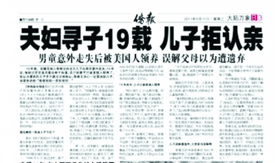 落戶蘇州的安徽蕪湖人李緒文,19年鍥而不舍尋子的故事經(jīng)本報披露后,得到社會各界關(guān)注。昨天,記者獲知最新進展:民政部下屬的中國兒童福利和收養(yǎng)中心,省民政廳下屬的江蘇省涉外婚姻和涉外收養(yǎng)登記服務(wù)中心(以下簡稱“江蘇雙涉中心”)均非常關(guān)注此事,并將在法律允許的范圍內(nèi)積極“搭橋”,聯(lián)系當(dāng)時的美國收養(yǎng)機構(gòu),轉(zhuǎn)達李緒文夫婦尋找李祥的消息。