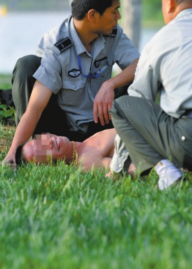 昨日下午,一名酒醉男子赤裸著上身,向掛有警示牌的天鵝湖深水區(qū)一步步走去。嚇得渾身是汗的施救人員急忙用計將該男子勸回岸邊。可面對施救人員,男子非但不領(lǐng)情,還對救援人員一頓喝罵,更讓人哭笑不得的是,為了嚇唬救援人員,醉漢還當眾耍起了拳腳。