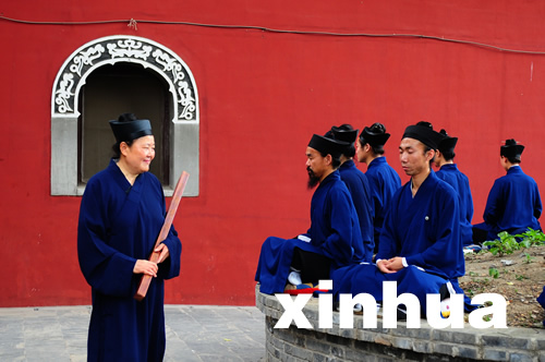 吳誠真方丈(左一)指導弟子們打坐修行內(nèi)丹(5月9日攝)。新華社記者 程敏 攝