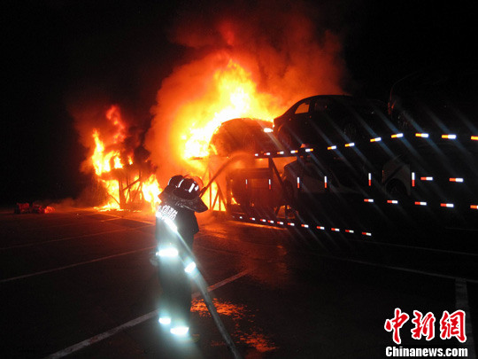 0時(shí)34分,高家堰消防執(zhí)勤點(diǎn)兩臺消防車首先到達(dá)現(xiàn)場。指揮員李學(xué)根介紹,此時(shí)半掛車上2/3的汽車被熊熊的火勢包圍,火勢燃燒迅猛。隨后,消防官兵分別從兩側(cè)對火勢蔓延方向進(jìn)行控制,同時(shí)組織高家堰服務(wù)區(qū)的工作人員啟動消防泵加壓給消防車供水,確;饒龉┧婚g斷,10分鐘后火勢得到有效控制。 經(jīng)過參戰(zhàn)官兵一個(gè)小時(shí)的撲救,成功將火撲滅,在被保存的6輛商品車中除一輛部分受損外其余5輛完好無損。據(jù)悉,失火的半掛車從重慶出發(fā)準(zhǔn)備運(yùn)往青島;馂(zāi)原因有待進(jìn)一步調(diào)查。(王申)