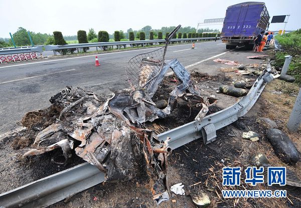 7月4日拍攝的事故車輛殘骸。當日3時50分許,隨(州)岳(陽)高速湖北省仙桃市毛嘴段一輛大客車被追尾致翻倒燃燒,目前死亡人數(shù)上升為26人,受傷31人,其中重傷3人,傷者已送到事發(fā)地附近的醫(yī)院治療。新華社記者 程敏 攝
