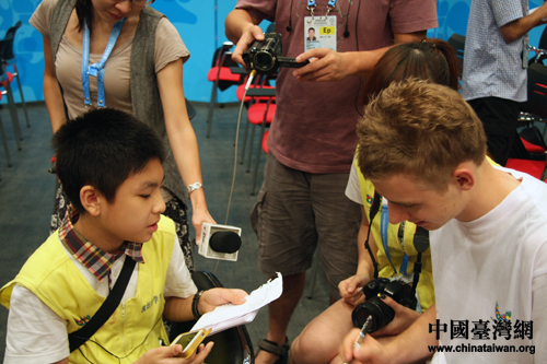 深圳小學生與外國青年記者在開營儀式上交流。(中國臺灣網(wǎng) 于斯文 攝)