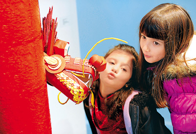 美國·華盛頓:華人居住集中的羅克維爾縣舉行慶祝中國農(nóng)歷新年活動。6歲半的哈娜·弗蘭克(左)和7歲的勞倫·波維奇與一個中國龍的裝飾親密合影。 新華社記者 王軼歐攝