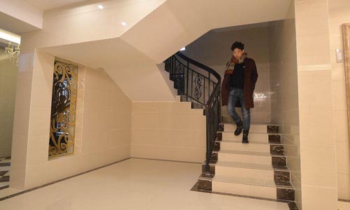 原本老舊失修的樓下防盜門換成了嶄新大氣的防盜門,增設(shè)了安防系統(tǒng)。進(jìn)門后是3盞亮閃閃的水晶吊燈,樓下還有一套實(shí)木家具供業(yè)主休息。墻上隨處可見字畫,這樣的磚墻一直延續(xù)到了整棟樓9層每一戶居民門前。有的業(yè)主甚至自己還增設(shè)了更多:把原本的普通防盜門換成高檔防盜門,把樓道間吸頂燈換成水晶吊燈。