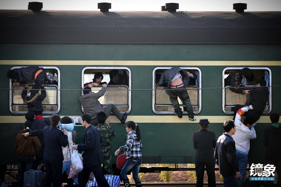 2016年春運已經(jīng)拉開大幕。作為人類史上規(guī)模最大的、周期性的大遷徙,春運在短短的十數(shù)日內的旅客發(fā)送量高達數(shù)十億人次。在此期間,許許多多的人們經(jīng)歷千辛萬苦,穿過大半個中國回家過年。而每當此時,隨著歸鄉(xiāng)的游子們紛紛匯入春運大潮,一幕幕的人在“囧”途也隨之上演。圖為2009年1月12日,惠州火車站,來不及上車的旅客,拉的拉,扶的扶,從車窗爬進車廂。圖片來源:央視網(wǎng)