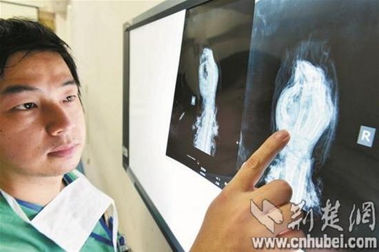 圖為:醫(yī)生介紹,手術(shù)前歡歡的右手拇指根部被炸斷