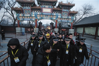 昨日,雍和宮大街,早7時,安保人員手挽手在前排引導(dǎo)香客們從大門走向售票處。當天是大年初一,大批游客與信眾前往雍和宮燒香祈福。本版攝影/新京報記者 彭子洋