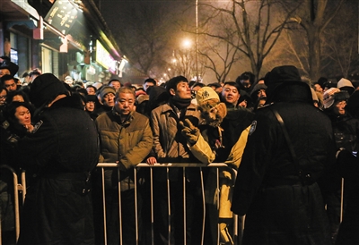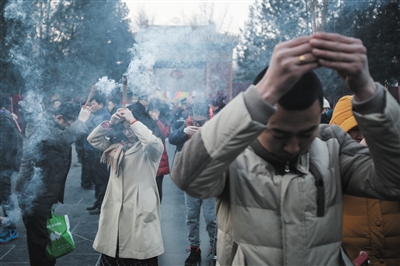 昨日凌晨5時,雍和宮門前已排起百米長隊,寬5米左右的通道擠滿了香客,被圍得水泄不通。不少排隊者穿著羽絨服棉鞋、頭戴棉帽,依然被凌晨的寒氣侵蝕,在原地來回跺腳,反復(fù)看著時間。