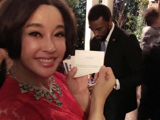 12日,劉曉慶微博曬照,稱:“剛剛見(jiàn)了美國(guó)總統(tǒng)奧巴馬,做為奧巴馬的NO.1 VIP貴賓!眲詰c穿紅裙大氣端莊,奧巴馬在花園里發(fā)表了近40分鐘的演講。