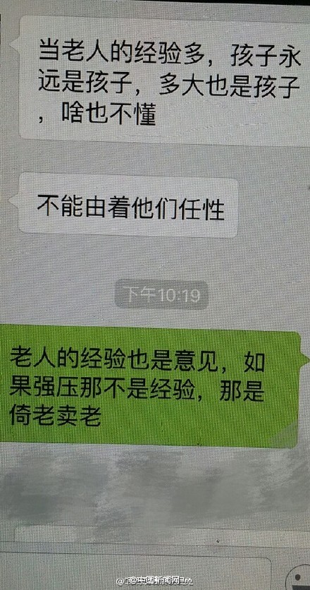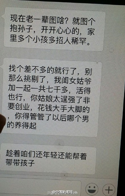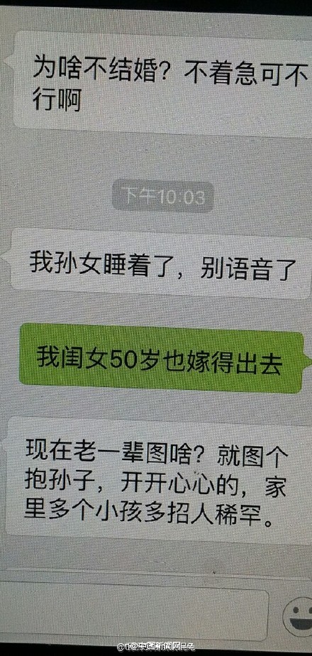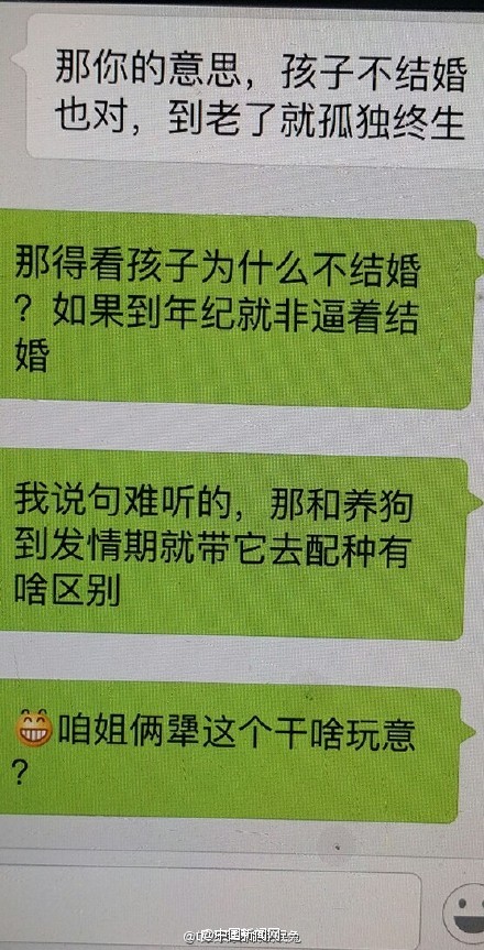 [我養(yǎng)女兒是因為我愛她!]近日,網(wǎng)友@氓氓氓氓氓氓氓兔 po出了自己母上大人的一組微信記錄,小編戳進去一看,簡直淚奔啊對方上來就是“不結(jié)婚讓別人笑話”、“不生個孩子老了就得等死”之類的理論狂轟濫炸,而老媽的回答確是…你還在被逼婚嗎?