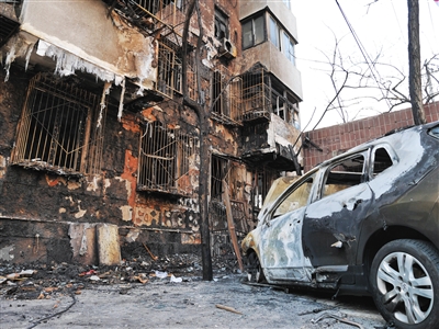 昨日,團(tuán)結(jié)湖北二條一號(hào)樓外墻被熏黑,樓下還有一輛被燒毀的轎車。新京報(bào)記者 王嘉寧 攝