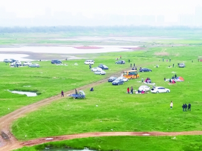 府河河灘常年綠草茵茵,其位于黃陂段府河大橋和盤龍大橋之間的河灘卻因踏青者將汽車開到河灘上,原本綠油油的草地出現(xiàn)一條條黃土路,大煞風(fēng)景。