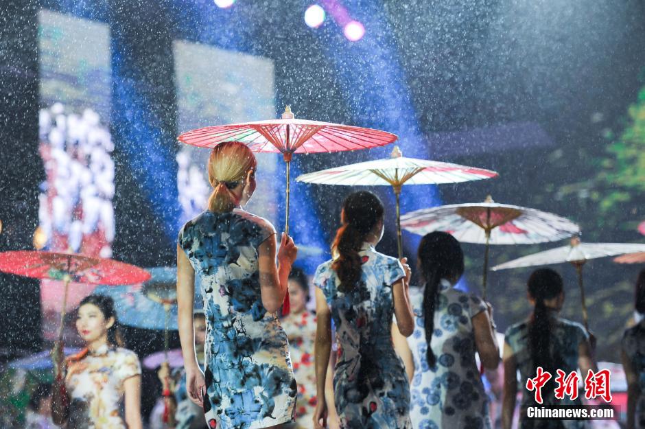 5月8日,模特身著旗袍手持油紙傘雨中走秀。當(dāng)日,以“慈善愛心·環(huán)保美麗”為主題的第31屆全球城市旅游小姐中國(guó)區(qū)決賽頒獎(jiǎng)盛典在貴州省赤水市舉行。本次大賽作為第11屆貴州旅游產(chǎn)業(yè)發(fā)展大會(huì)系列活動(dòng)之—,共吸引海內(nèi)外50多名選手同臺(tái)競(jìng)技。中新社記者 賀俊怡 攝