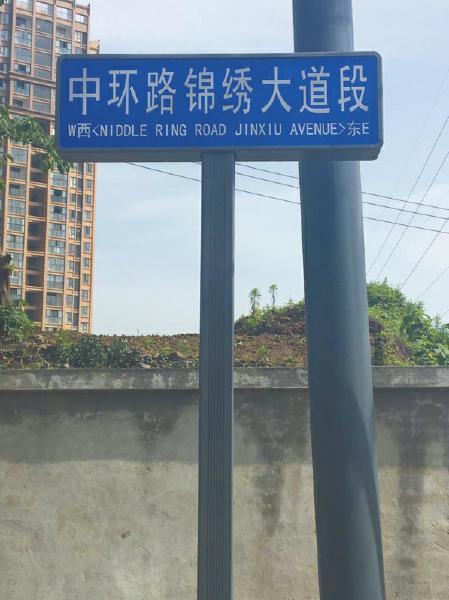路牌就立在路口的人行道上,藍(lán)底白字,寫著“中環(huán)路錦繡大道段”,中文下面,還有英文翻譯,字號(hào)稍小,寫著“NIDDLE RING ROAD JINXIU AVENUE”!拔也榱,根本沒(méi)有‘NIDDLE’這個(gè)詞,應(yīng)該是‘MIDDLE’吧,中間的意思。”