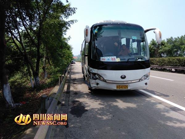 四川新聞網(wǎng)記者在現(xiàn)場(chǎng)看到,出租車(chē)被撞后,整個(gè)車(chē)身嚴(yán)重變形,反方向靠到路邊,地上玻璃、碎片散落一地。而前面停下來(lái)的一輛大客車(chē),前擋風(fēng)玻璃破裂,右前門(mén)損壞,已經(jīng)不能打開(kāi)。兩輛車(chē)是在主車(chē)道發(fā)生追尾。