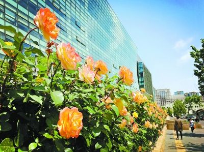 東長安街一座大廈前數(shù)百株樹狀月季競相綻放,為街道平添幾分嬌艷。本報記者 方非攝