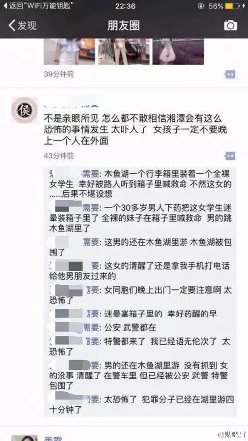 28日上午,湘潭公安通報了該案詳情。6月27日晚21時31分,湘潭市公安局指揮中心接到報警稱:岳塘區(qū)木魚湖附近有人將一裸體女子關(guān)入行李箱中。接警后,河東沿江風光帶巡特警、武警聯(lián)合巡邏組5分鐘內(nèi)趕赴現(xiàn)場,和周圍群眾、寶塔派出所民警迅速解救并安撫女子。同時,組織警力對跳入木魚湖中企圖逃跑的涉案男子實施圍捕,市局、分局值班領(lǐng)導現(xiàn)場指揮,附近警力快速支援。經(jīng)工作,23分20時許,在湖中將涉案男子抓獲。