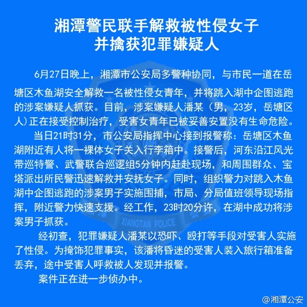 人民網(wǎng)北京6月28日電(記者孝金波)27日,網(wǎng)傳湖南湘潭木魚湖“有一女生被全裸裝在行李箱里,在她呼喊救命時,被路人發(fā)現(xiàn),后涉案男子跳入湖中”,引發(fā)關(guān)注。今天上午,湘潭警方通報,27日晚市公安多警種協(xié)同,與市民一起安全解救一名被性侵女青年,并將跳入湖中企圖逃跑的涉案嫌疑人抓獲。目前23歲的涉案男子潘某正在接受控制治療,受害女青年已被妥善安置沒有生命危險。