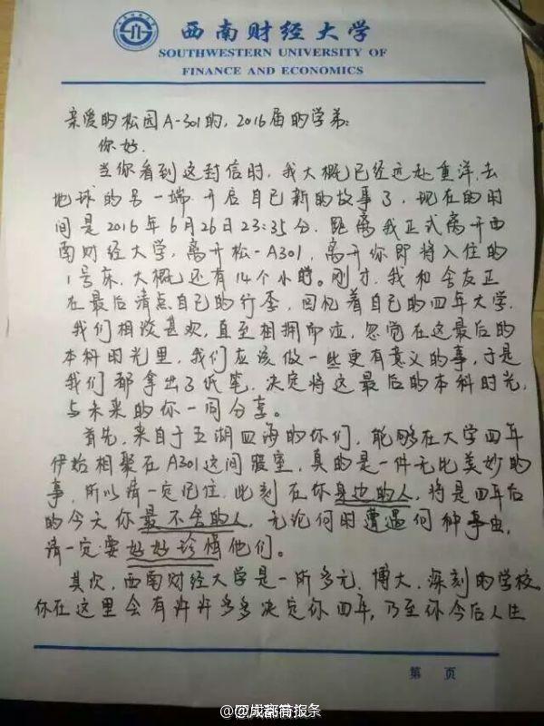未見卻真情!畢業(yè)學(xué)長給未來同寢學(xué)弟留“內(nèi)心獨白”】西南財經(jīng)大學(xué)的劉陽,在畢業(yè)離校前夜,給未來入住寢室的學(xué)弟留下一封信:“此刻在你身邊的人,將是4年后的今天你最不舍的人”“對于愛情,即使是痛苦也會令你有所收獲”…學(xué)弟看到會不會滿滿感動?via四川高校頭條