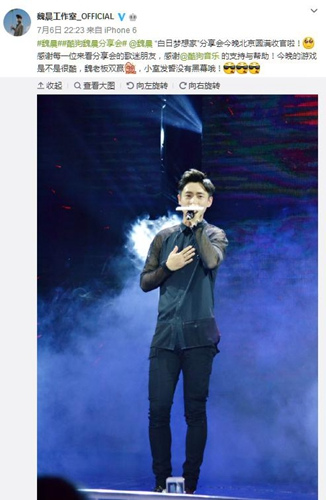 資料圖:魏晨在分享會(huì)上唱歌。(魏晨工作室微博截圖)