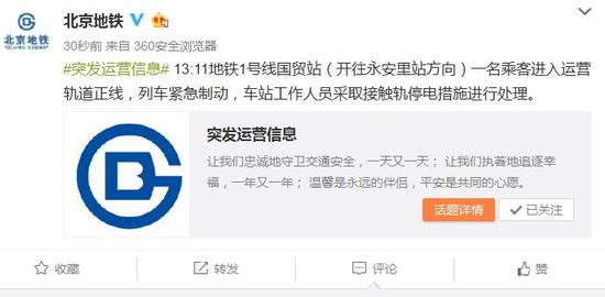(原標題:一名乘客進入北京地鐵1號線運營軌道 列車緊急制動)