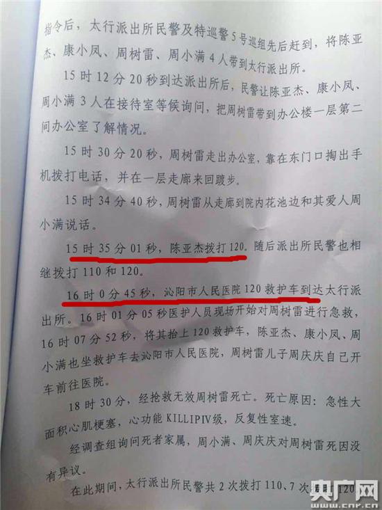 陳亞杰這樣描述當時的經過:他說不舒服的時候我就馬上打的120,我說太行派出所有人暈倒了,(120)他說哦,馬上到!我記得很清楚,對方是 個男的。打過120之后急救車已經過來了,但是沒進院里,我聽見聲音了,到了之后又走了。我媽說了一句怎么來了又走了,我趕緊15點37分又給120打了 一次。我說趕緊過來唄,那邊說已經派車過去了。