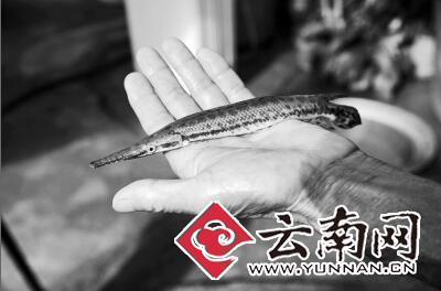 “那天捉魚時,我看到以為是一條蛇魚,后來把水草扒開,看它的嘴巴,才發(fā)現(xiàn)是一條沒見過的怪魚。”黃月朋說,當(dāng)時他伸出去的手被嚇得馬上縮了回來,沒敢捉。后來還是一個膽大的朋友快速把它抓起來放在桶里面,“村里還從來沒有人捉到過這種魚。”