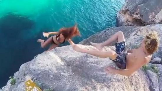 視頻中,這對身份不明的情侶坐在懸崖上俯瞰美麗的泄湖水域。穿著比基尼的年輕女子準備跳入水中卻不慎絆倒,驚慌失措地抓住了巖壁。接著,她伸手欲抓住男友的腿爬上懸崖——然而男子卻把腿移開,從容地目睹著女友滑落崖壁,跌入水中。