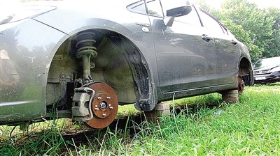 昨日上午,記者來到本田車停放現(xiàn)場。該車四周停放有上百輛轎車,唯獨本田轎車4個輪胎連輪轂全部被卸走,只留下已經(jīng)是銹跡斑斑的剎車轂。車輪旁邊平整地支起5塊紅磚。車底雜草叢生,車身四周滿是塵土,由此推斷,車輪被卸已經(jīng)有很長時間了。