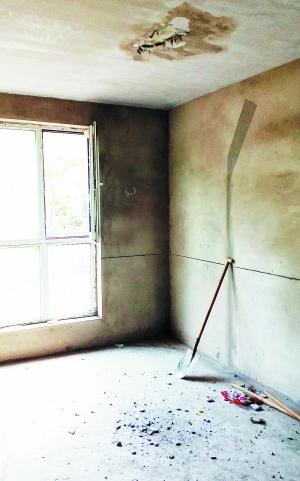 在房子西南角的臥室與客廳相隔的一堵墻上,記者看到了一個大洞。王大永說:“這是我用手拍墻拍出來的,驗房時,我想既然有空洞,里面究竟什么樣?我很想看看,就用手拍了一下,結(jié)果墻就出了個洞,薄薄的一層水泥,里面是苯板。我在這里拍出了個洞,在檢查廚房的時候,我又在廚房的東墻上拍出了個洞!