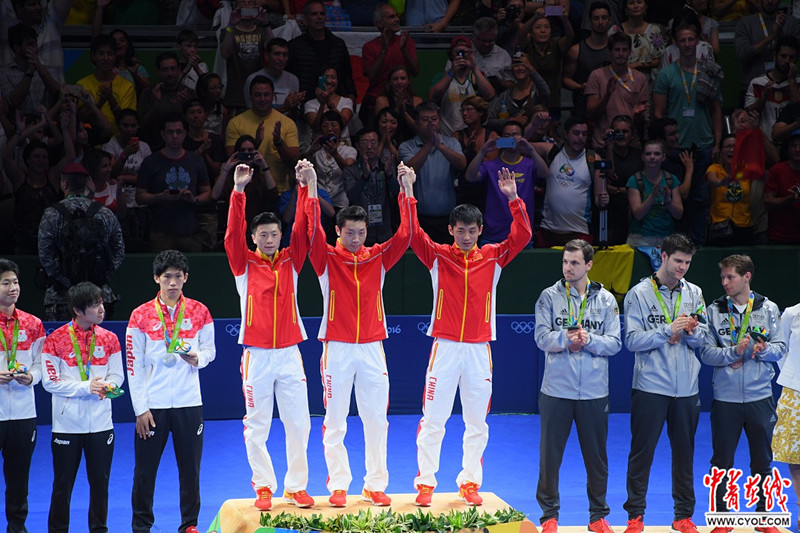 8月17日,中國隊選手馬龍、許昕和張繼科(從左至右)在頒獎儀式上向觀眾致意。當日,在2016年里約奧運會乒乓球男子團體賽決賽中,中國隊以3比1戰(zhàn)勝日本隊獲得金牌。中國青年報·中青在線記者 慈鑫 攝