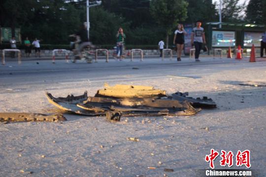 現(xiàn)場散落的破碎車輛保障杠。 于俊亮 攝