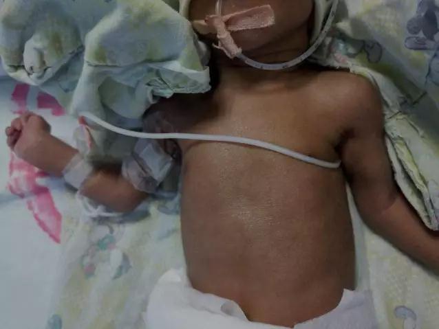 7月初,在福州市第一醫(yī)院,產(chǎn)婦阿玲(化名)早產(chǎn),懷孕僅33周,她就誕下了小黑,當(dāng)時(shí),小黑重度窒息,醫(yī)生緊急搶救后,他立即被轉(zhuǎn)送到新生兒科繼續(xù)治療,戴上了呼吸機(jī)。醫(yī)生發(fā)現(xiàn),小黑很瘦弱,軀干只有成人的巴掌大,且全身黑得像包公,尤其是顴骨、頸部、手肘、關(guān)節(jié)等皮膚更黑,連指甲都是黑的,更奇怪的是,他的陰莖僅1厘米長(zhǎng),縮成一團(tuán),黑得跟炭一樣。