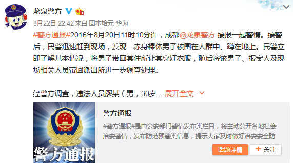 通報(bào)稱,2016年8月20日11時(shí)10分許,成都龍泉警方接報(bào)一起警情。接警后,民警迅速趕到現(xiàn)場(chǎng),發(fā)現(xiàn)一赤身裸體男子被圍在人群中、蹲在地上。民警立即了解基本情況,將男子帶回其住所讓其穿好衣服,隨后將該男子、報(bào)案人及現(xiàn)場(chǎng)相關(guān)人員帶回派出所進(jìn)一步調(diào)查處理。