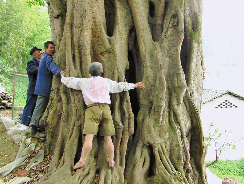 當(dāng)?shù)厝藫?dān)憂古樹,也親近古樹,夏天沒事,就約上幾個人進入樹干里面打牌玩。因為樹干殼的局部枯朽,形成了大洞小孔,從樹干里面往外看,這些孔洞好似開的門窗,人們可從樹窗隨意探出頭或身子,所以樹干中光線不錯。樹干約齊人胸高處,有一個較大的孔洞,算是人們進出的門。