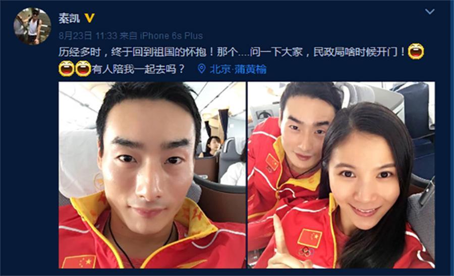 8月24日消息,在剛剛結(jié)束的里約奧運(yùn)會(huì)上,秦凱在女子三米板決賽之后的頒獎(jiǎng)禮上向交往多年的女友何姿求婚,現(xiàn)場(chǎng)氣氛相當(dāng)浪漫,在全世界體育迷的見(jiàn)證下,何姿幸福地接受了秦凱的求婚。8月23日,秦凱在微博曬出與何姿在飛機(jī)上的合影,稱已經(jīng)回到祖國(guó)懷抱,話鋒一轉(zhuǎn),急問(wèn)網(wǎng)友“民政局啥時(shí)候開(kāi)門!有人陪我一起去嗎?”秦凱這條狀態(tài)發(fā)布之后,女主角何姿馬上轉(zhuǎn)發(fā)并附上回復(fù):“你還想誰(shuí)陪你一起去?”圖片來(lái)源:秦凱認(rèn)證微博