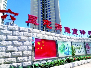 在姚家園路與甜水園街十字路口的東北角,記者昨日看到一堵墻上懸掛著“六里屯街道宣傳教育園地”字樣,張貼著幾幅關于精神文明等內(nèi)容的紙質(zhì)宣傳畫。排頭的是一幅五星紅旗,國旗上四顆小星星平行排列(如圖)。