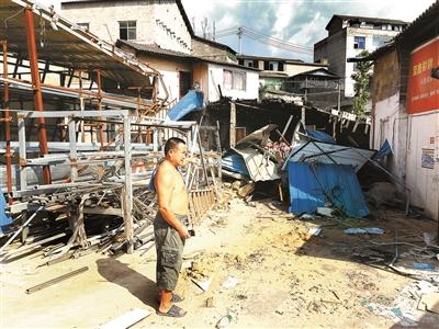 房東盧昌忠在倒塌的廢墟前