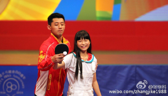乒乓球運(yùn)動(dòng)員張繼科指導(dǎo)女孩打球。(微博截圖)