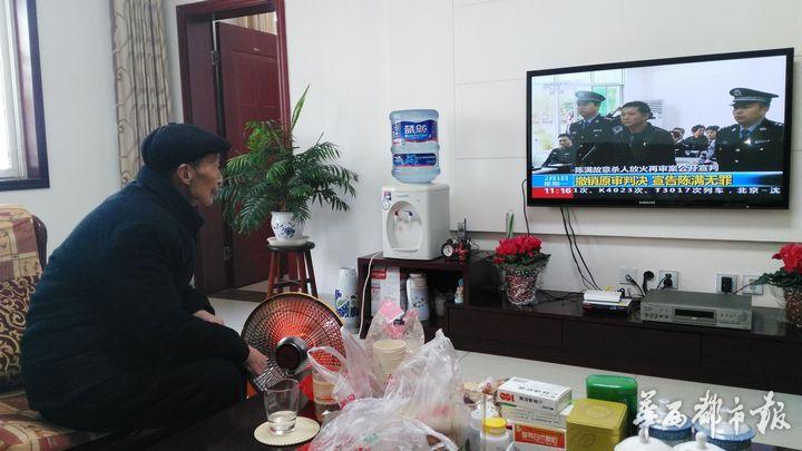 陳元成觀看兒子陳滿無(wú)罪釋放的新聞報(bào)道