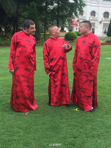 9月7日,郭德綱微博曬出與“憨豆先生”扮演者羅溫·艾金森(Rowan Atkinson)一同工作的花絮照,并寫道:“讓他穿大褂容易,教他唱快板有點(diǎn)難…… ”畫面中,他與“憨豆先生”穿大紅褂唱快板,畫面搞笑有趣,似乎未受“曹云金長文開罵”事件影響。